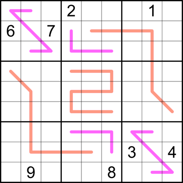 The pink/purple lines are normal Renban lines: they contain a non-repeating set of consecutive digits, in any order.