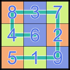 Modular: Any sequence of 3 adjacent digits along a teal line must contain a complete set of residuals modulo 3, i.e: one from (1,4,7), one from (2,5,8) and one from (3,6,9).