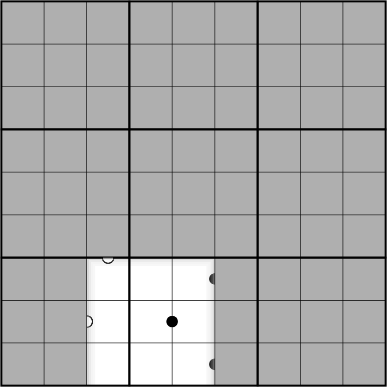 - Zeichne eine 1-Feld-breite "Mauer", die das Spielfeld so teilt, dass die weißen Punkte von den schwarzen Punkten getrennt sind. Die Mauer darf sich nicht verzweigen oder selbst berühren (auch nicht diagonal).