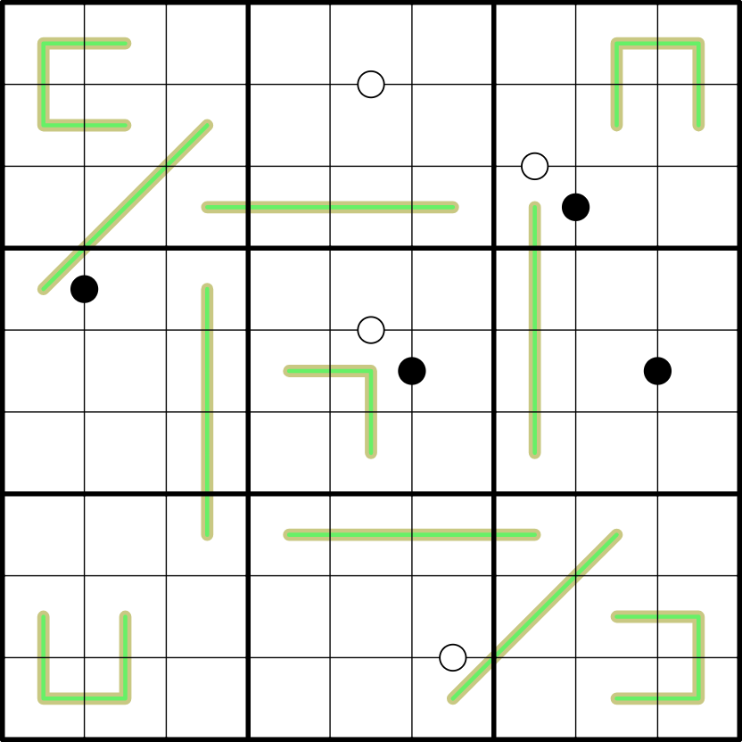 Kropki dots: Digits in cells joined by a white dot are consecutive. Digits in cells joined by a black dot are in a 1:2 ratio (i.e., one digit will be double the other). Not all dots are necessarily given.