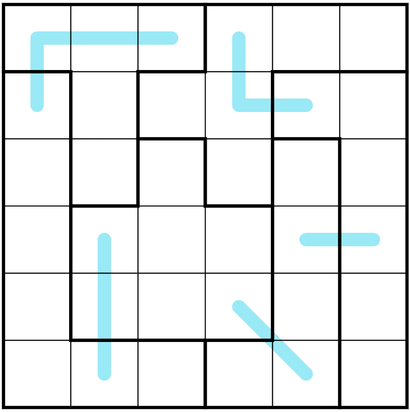 Region Sum Lines: Blue lines in the grid are Region Sum Lines. Lines are split into segments by region borders. Within each individual line, the sum of the digits on each segment is the same. The sum of segments on different lines may or may not be equal.