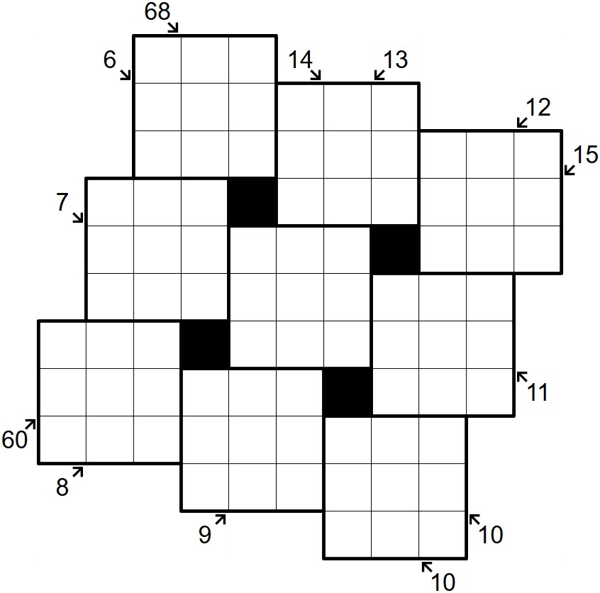 Teleports: There are 4 black squares in the middle of the grid, which are not part of the grid itself. Those are teleports for little killers. When a little killer enters a teleport, it is teleported to one of the 3 remaining teleports and continues in any of the 4 diagonal directions. Multiple little killers may share the same path.