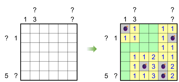 - Japanese Sums: Clues outside the grid represent the sum of digits in each contiguous sequence of clued cells, in the order of appearance from left to right or top to bottom. Consecutive sequences must be separated by at least one mine cell or one empty cell.
