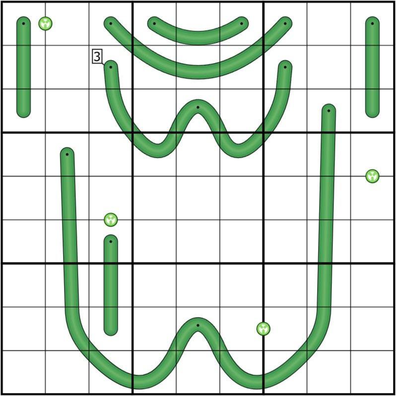 Sausages: Divide each of the chorizo verde [lines] into at least two sausages. The difference between the sums of two linked sausages on a chain must be exactly equal to the number of sausages in that chain.