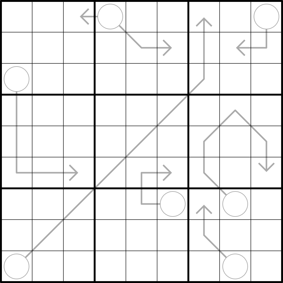 Arrow: The sum of the values along an arrow is equal to the value in the connected circle. Digits and values along an arrow can repeat if allowed by other rules.