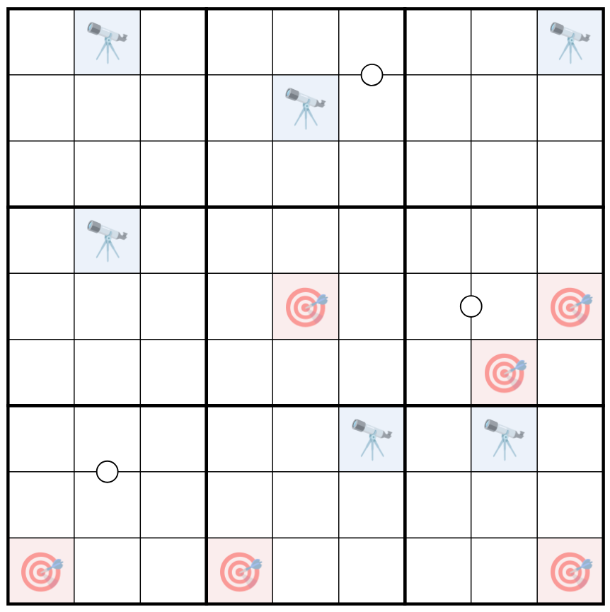 Von einem blauen Fernrohr-Feld mit der Ziffer N beträgt der Abstand zur nächstgelegenen weiteren N mehr als N. Keine Ziffer steht mehrmals auf einem Teleskop.
