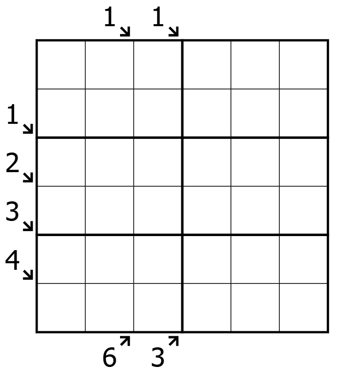 - Diagonal Outside: Clues outside the grid give digits that must appear in the first three cells, exactly once, in the indicated diagonal direction.