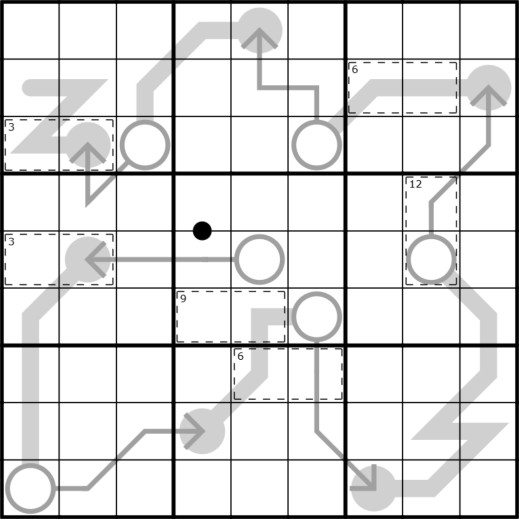 ARROWS(+) (Point downhill)- Numbers on arrows sum to the number in the arrow's circle. ALSO, NUMBERS ON ARROWS DECREASE AS YOU MOVE AWAY FROM THE CIRCLE.