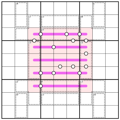 In the shaded 5x5 central area, ALL consecutive pairs of digits are marked with a white dot.