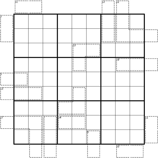 Each digit within the 9x9 region represents a skyscraper of that height. Digits outside this region indicate how many buildings can be seen from that direction, where higher buildings block the view of lower buildings. The small numbers in the upper left corner of a cage indicate the sum of the digits in that cage. Within a cage all digits must be different.