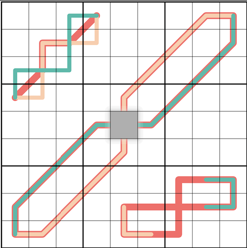 Entropic Lines: Any consecutive set of 3 cells along a peach line must contain one digit from each of the sets [1 2 3], [4 5 6], and [7 8 9].