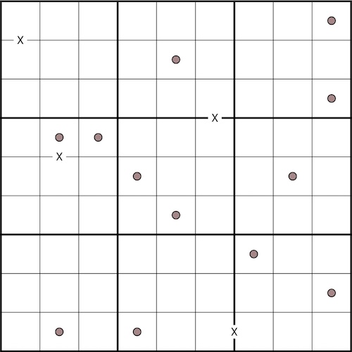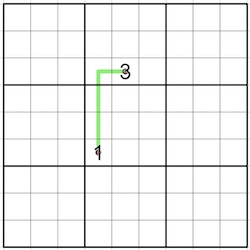 Each point in the sudoku grid is connected to exactly one other point. When two points are connected, draw the following lines to connect them: one line going straight up (the rise), one line going straight right (the run). In this sudoku, the rightmost point must always be the uppermost point (no negatives slopes!).