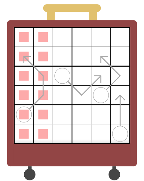 Indexing: Cells with red squares are index cells. If an index cell in column X has a value of Y, then the cell in column Y in the same row has a value of X (e.g. if r3c1 has a value of 5, then r3c5 has a value of 1). An index cell may contain two digits, but may not have a value greater than 6. If an index cell has a value of zero, the value being indexed does not appear in the row. Nothing in these rules prevents a value from repeating in a row, even if one instance of that value is referenced by an index cell.