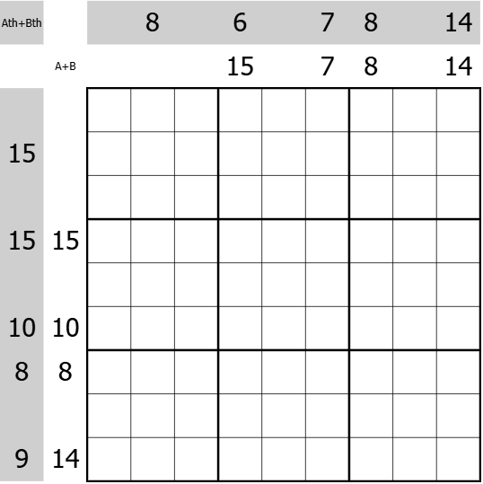 Die Ziffern im ersten und zweiten Kästchen von oben und von links sind A und B. Die Hinweise außerhalb des Gitters machen Angaben zu A und B: