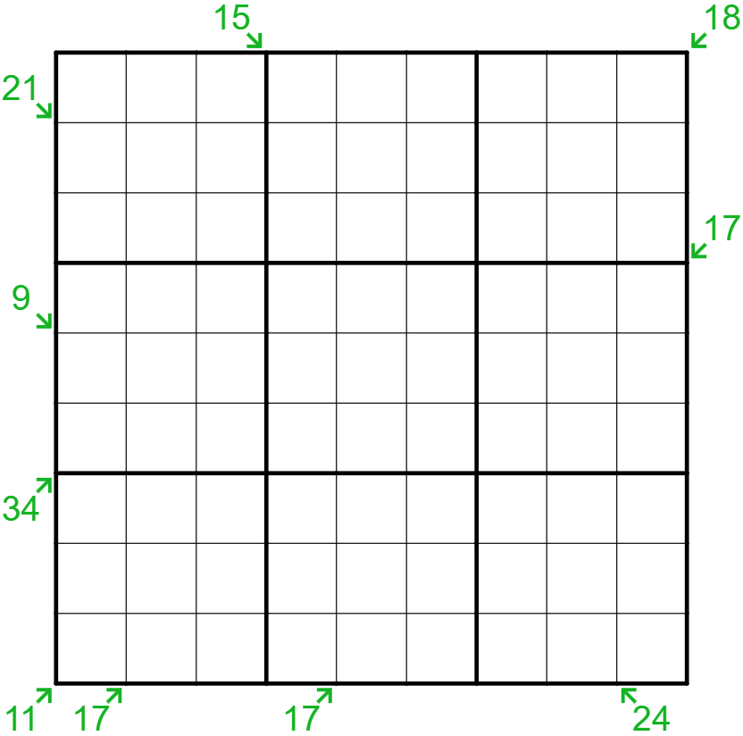 German Sums (Little Killer): A clue outside the grid gives the sum of all continuously diagonally adjacent digits with a difference of at least 5 up to (and not including) the first digit with a difference of 4 or less along the indicated diagonal from the direction of the clue. A digit in the first cell is always included in the sum. Digits may repeat if allowed by other rules.
