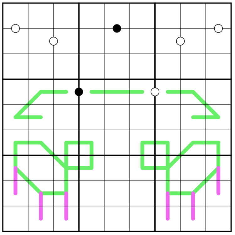 Kropki Pairs: Ein schwarzer Punkt trennt Ziffern in einem Verhältnis von 1:2, ein weißer Punkt aufeinanderfolgende Zahlen. Nicht alle Punkte sind notwendigerweise gegeben.