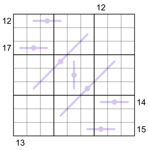 - Up to N-Summen: Ein Hinweis außerhalb von Reihe oder Spalte N gibt die Summe aller Ziffern an bis zu der Zelle, welche die Ziffer N enthält. (Die Ziffer N selbst ist nicht Teil der Summe.)
