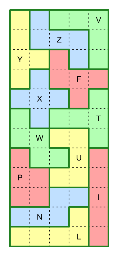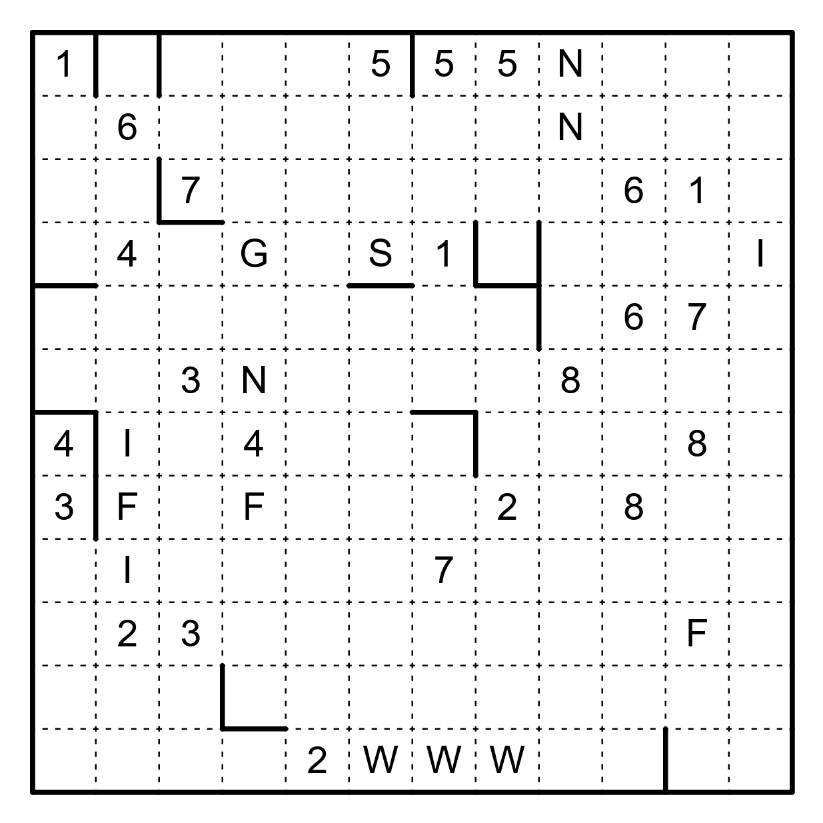 - Pentominous: In diesem Bereich muss jeder Unterbereich aus exakt fünf Zellen bestehen (sogenannte „Pentominoes“); zudem dürfen keine zwei Pentominoes derselben Form (einschließlich Rotationen und Spiegelungen) eine gemeinsame Kante aufweisen (etwaige Fünf-Zellen-Unterbereiche im Haisu-Bereich werden bei dieser Regel außer Acht gelassen). Ein Buchstabenhinweis (FILNPTUVWXYZ) in diesem Bereich gibt die Form des Pentomino an, das diese Zelle enthält.