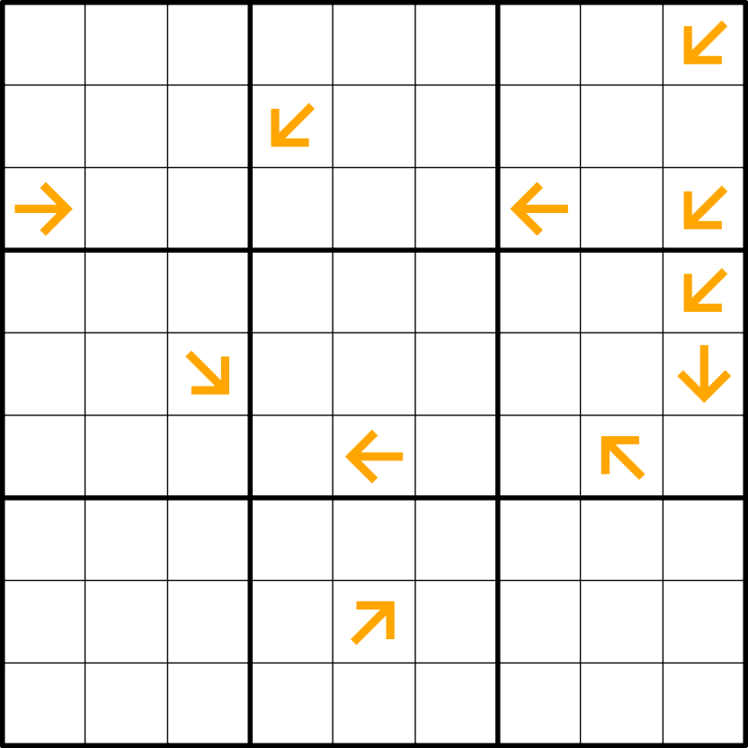 Eine Ziffer in einem Kästchen mit einem orangen Pfeil gibt an, wie viele Ziffern in der angezeigten Richtung um mindestens 4 von dieser Ziffer abweichen.