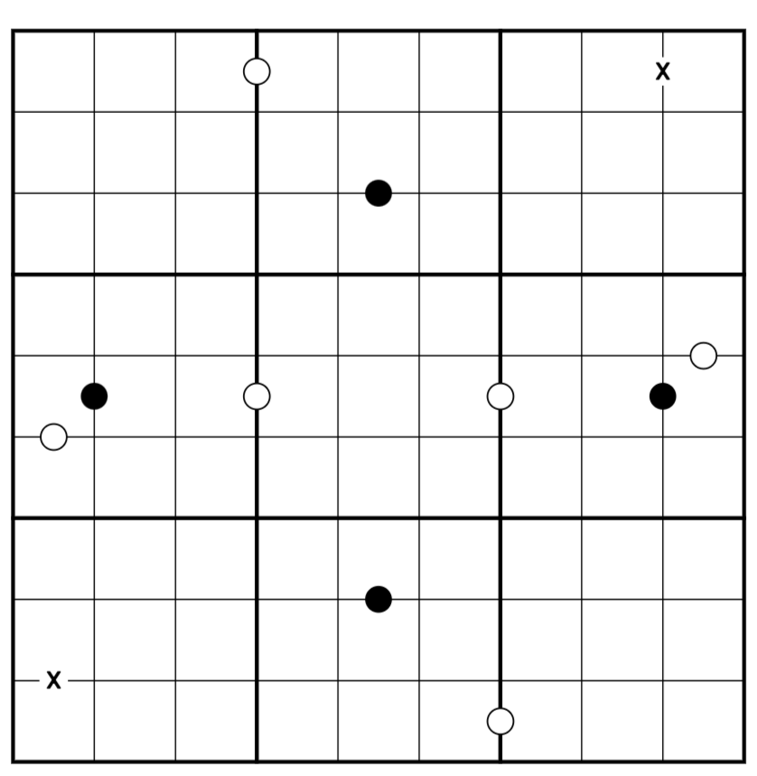 Every odd digit in boxes 1 and 9 must see an identical digit within a single king's move (in chess).