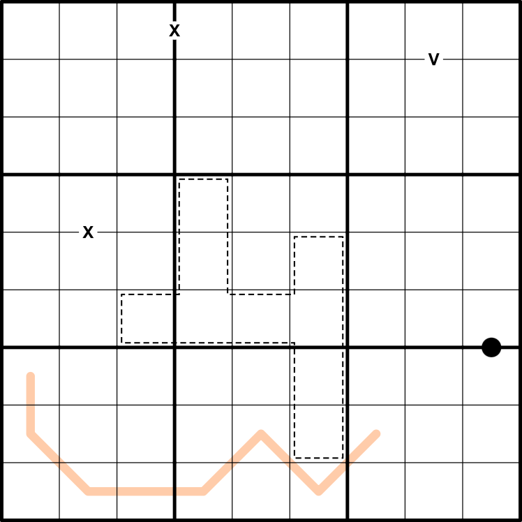 Inspiriert von einem Kommentar von Fisherman Neulich habe ich mein Sudoku-Rätsel, das auf CTC vorgestellt wurde, überprüft und festgestellt, dass es über 12.000 Lösungen hatte. Ich brauchte ein paar Minuten, um das zu begreifen. Ich möchte mich an dieser Stelle bei jedem Einzelnen bedanken, der sich die Zeit genommen hat, eines meiner Rätsel zu lösen. Ich liebe es, Rätsel zu erstellen, aber ohne euch, die ihr sie löst, würde ich das nicht tun. Ihr macht das möglich, also vielen Dank, und ich hoffe, euch gefällt dieses Rätsel. Es gelten die normalen Sudoku-Regeln. Ziffern, die einen Zug eines Springers oder Königs im Schach voneinander entfernt sind, müssen unterschiedlich sein. Ziffern dürfen sich innerhalb eines Käfigs nicht wiederholen. Jede Dreiergruppe von Ziffern entlang einer orangefarbenen Linie muss eine Ziffer aus 1, 2, 3, eine aus 4, 5, 6 und eine aus 7, 8, 9 enthalten. Durch ein X oder V getrennte Ziffern ergeben in der Summe zehn bzw. fünf. Durch einen schwarzen Punkt getrennte Ziffern stehen im Verhältnis 1:2. Nicht alle XV oder schwarzen Punkte sind notwendigerweise angegeben.