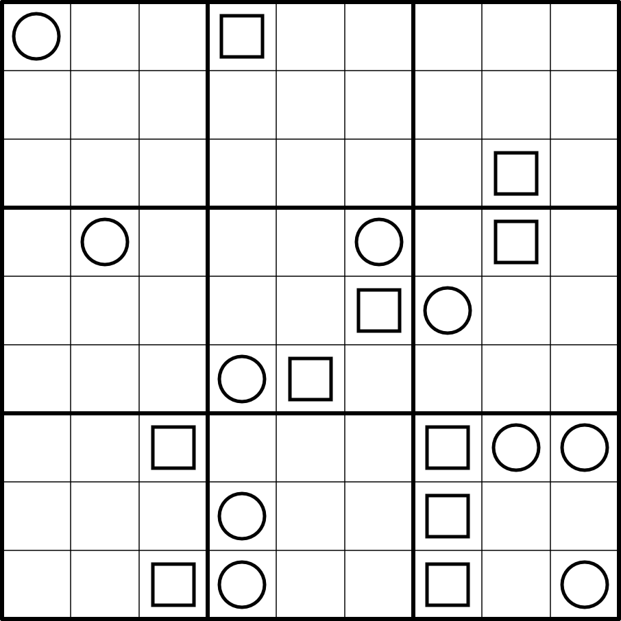 All possible circles and squares are given.