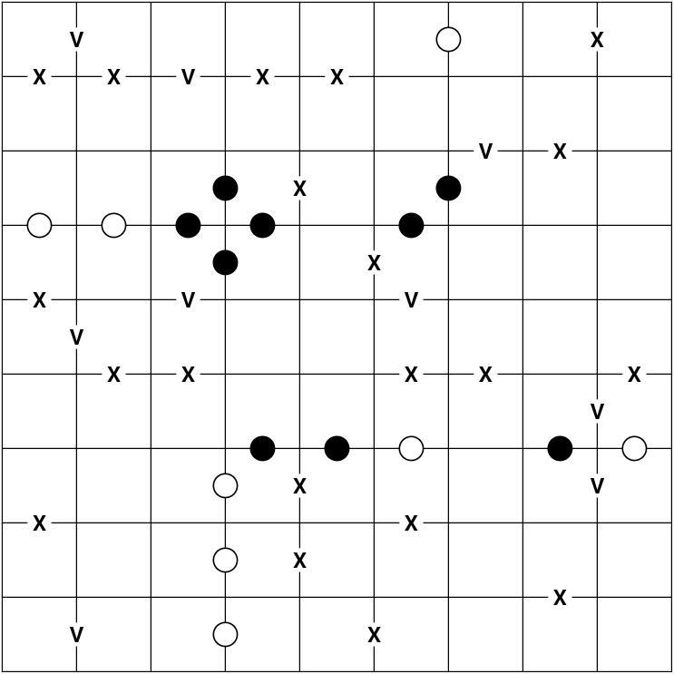 3. V's sum to 5, and X's to 10. In each case, both cells share a region.