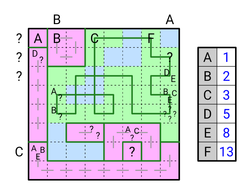- Jeder Buchstabe steht für eine andere positive ganze Zahl. Ein Fragezeichen kann für jede positive ganze Zahl stehen, aber Zahlen dürfen sich in einem Hinweis nicht wiederholen. Beispielsweise muss ein „??“-Lohkous-Hinweis zwei unterschiedlich lange Abschnitte in seinem Bereich enthalten. Ein nicht vereister Abschnitt mit vier Zellen darf keinen „?/?/?“-Hinweis (mindestens sechs) oder einen „B/?“-Hinweis mit B=2 enthalten (das Fragezeichen wäre eine weitere Zwei), usw.