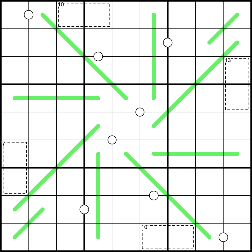 Digits separated by a white dot are consecutive. If a dot is on a corner between four cells, it applies to both diagonal pairs.