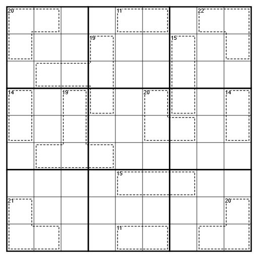 - Killer-Käfige: Ziffern in einem Käfig dürfen sich nicht wiederholen und ergeben in der Summe den oben links angegebenen Wert.