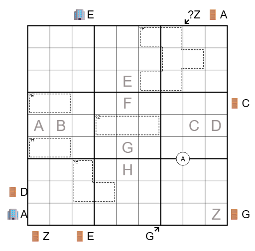 Each letter from ABCDEFGHZ stands for a different digit from 1-9. Each labeled gray letter cell in the grid contains that digit. Other clues in the grid are standard killer, little killer, quadruples, skyscraper, or numbered rooms clues. Details below.
