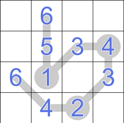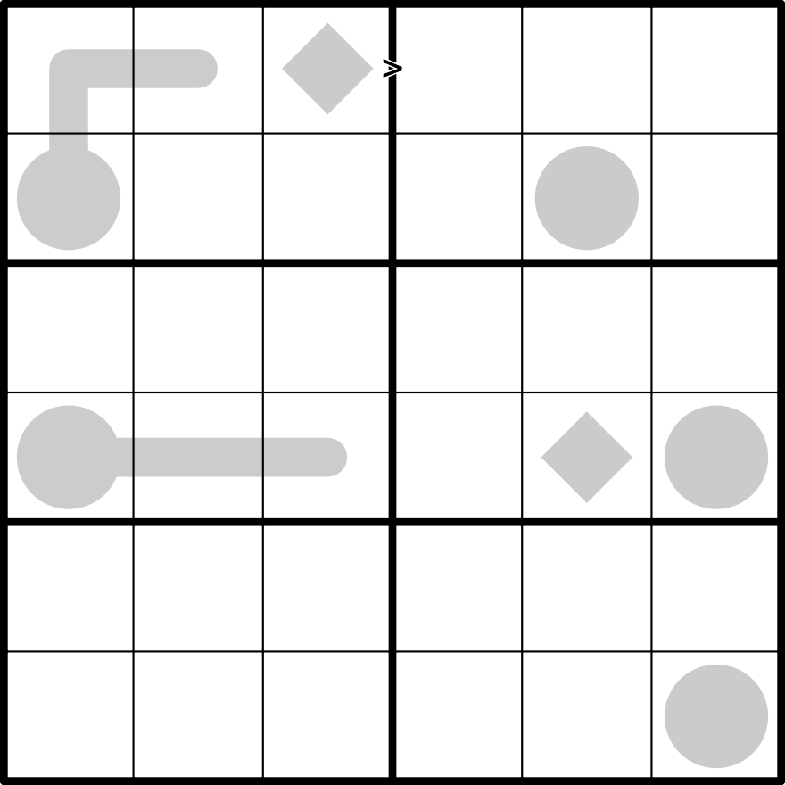The thermometer chain may not pass through a cell with a diamond, and the inequality sign points to the smaller digit it sits between.