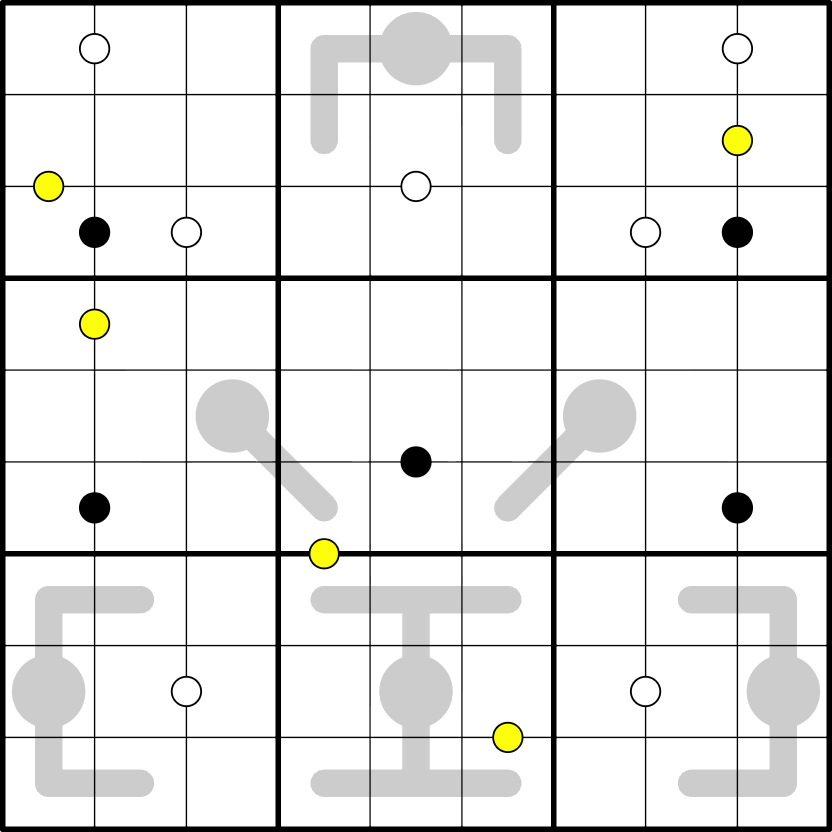 Yellow Dots: Digits in cells joined by a yellow dot are not consecutive.