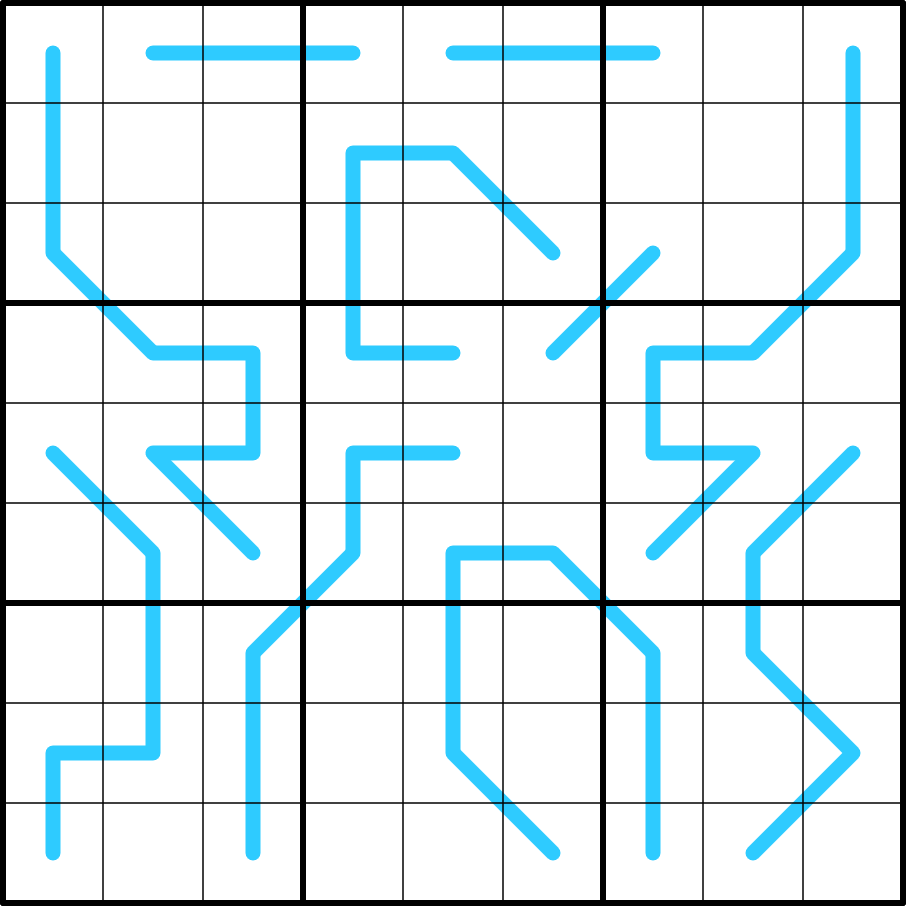 Normal sudoku rules apply. Box borders divide each blue line into segments with the same sum.