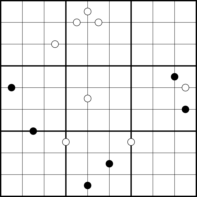 Digits separated by a white dot are consecutive. Digits separated by a black dot are in a 1:2 ratio. Not all dots are given.