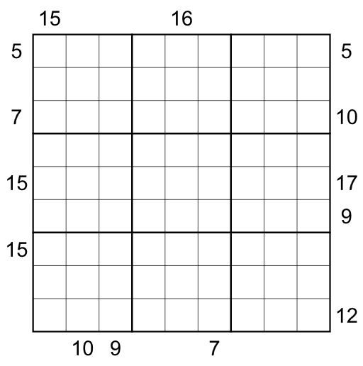 - Ascending Sums (aka Ascending Starters): Ein Hinweis außerhalb des Gitters gibt in der entsprechenden Reihe oder Spalte aus Richtung des Hinweises die Summe aller fortlaufend ansteigenden Ziffern an bis zu der ersten Ziffer, die absteigend ist (diese nicht eingeschlossen).