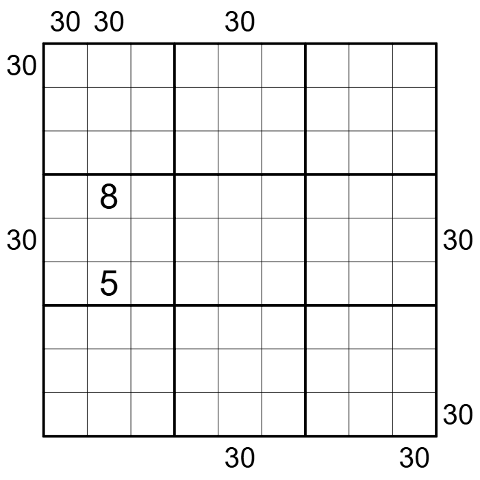 X-Sums: A clue outside the grid gives the sum of the first X digits of that row or column from the direction of the clue, where X is the digit placed in the cell next to the clue.
