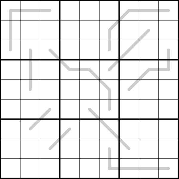 Equalines: Die Zahlen entlang jeder Linie müssen die gleiche Summe ergeben, welche vom Löser zu bestimmen ist. Dabei dürfen sich Zahlen auf einer Linie wiederholen, wenn es die Sudoku-Regeln erlauben.