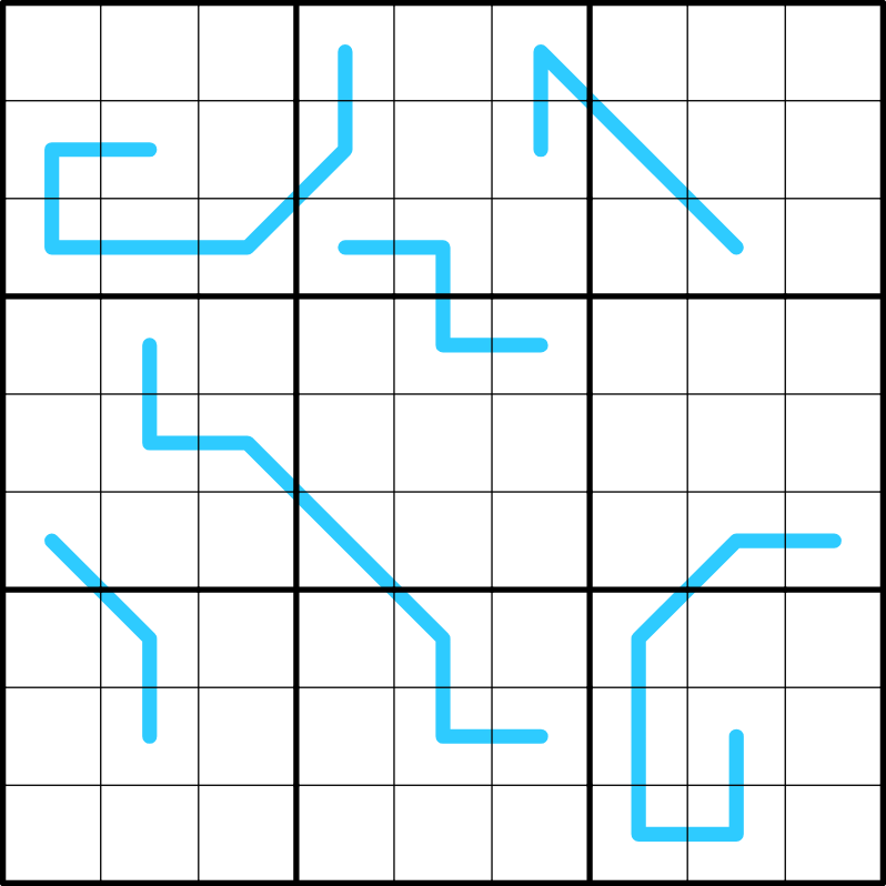 Each row, column, and 3x3 box contains the digits 1 through 9. Box borders divide blue Region Sum lines into segments with sums of equal value.