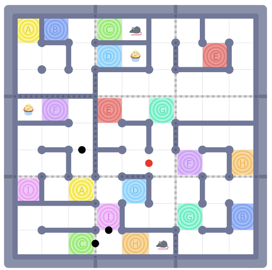 AIM OF EXPERIMENT: Finkz and Phinx must both reach different cupcakes by finding a path through the maze. The paths must not visit any cell more than once, cross themselves or each other, share cells, or pass through any thick maze walls.
