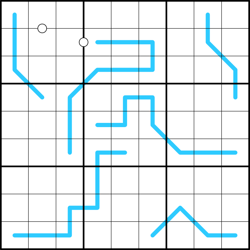 REGION SUM LINES: box borders divide blue lines into segments. The sum of digits on each segment is the same. This sum may be different for different blue lines.