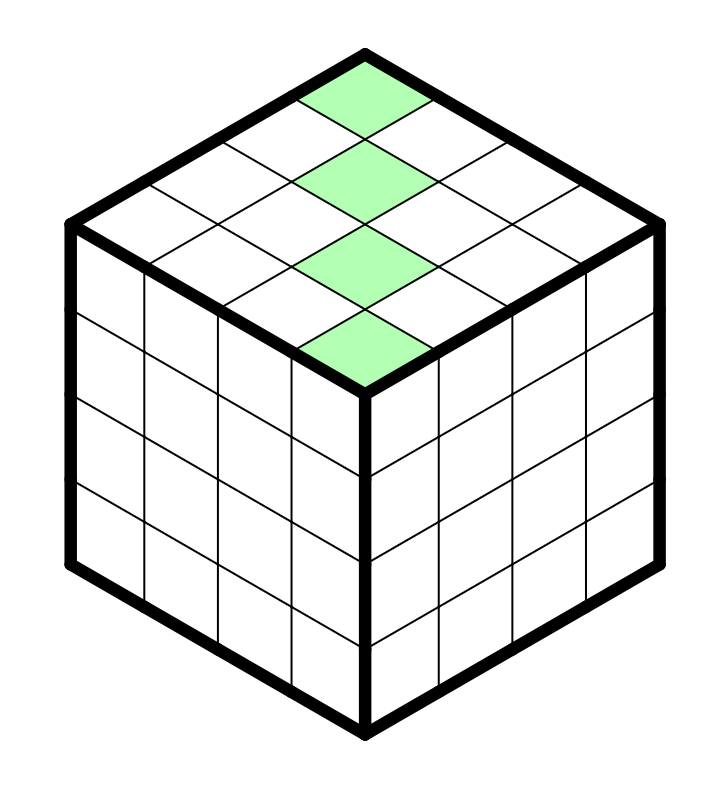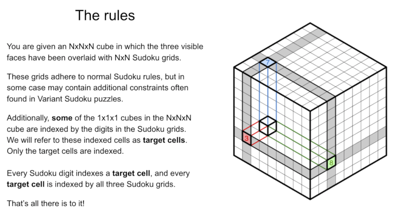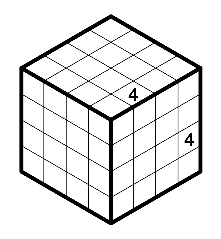 Each visible face of the cube is a 4x4 latin square, which contains the digits 1 through 4 once each in every row and column. Every digit in each grid indexes a 1x1x1 target cell within the cube, and each target cell must be indexed by all three grids. The digit 1 in a cell specifies that the target cell is the 1x1x1 cube closest to the surface of the cube where the digit is located, whereas a digit 2 in a cell indicates that the target cell is the second cube down from the surface, and so on.