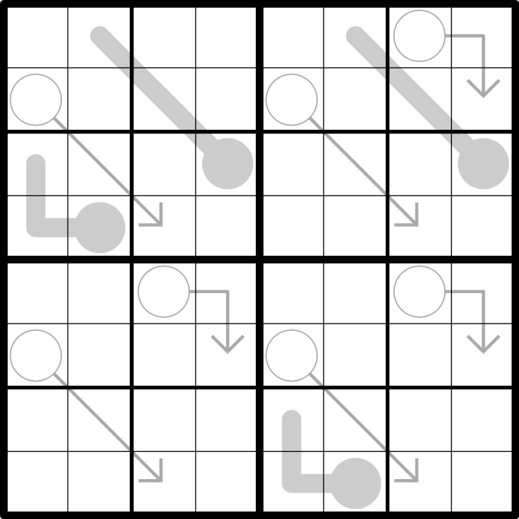• Little to Big: Clues that apply to any quadrant of sub cells also apply to the corresponding super cells in the full puzzle. For example, the bent arrow in sub cells r1c7, r1c8, r2c8 is also applied to super cells r1c3, r1c4, r2c4 (and subsequently, the bent arrows in sub cells r5c3, r5c4, r6c4, and r5c7, r5c8, r6c8 point to the same super cell arrow in r1c3, r1c4, r2c4).