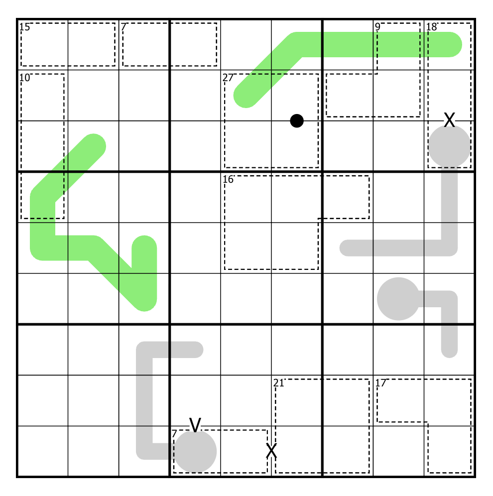 Cells connected by an X sum to 10. Cells connected by a V sum to 5. Not all Xs and Vs are given.