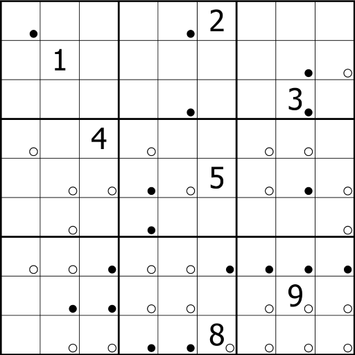 • Where the cells with the digits 1 and 2 are orthogonal neighbours, either the white dot or the black dot is present, but not both.