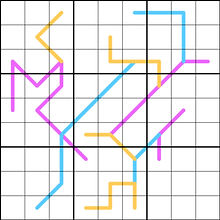 Every coloured line is a zipper line. Pairs of cells an equal distance from the centre of a zipper sum to the digit in the central cell of that zipper.