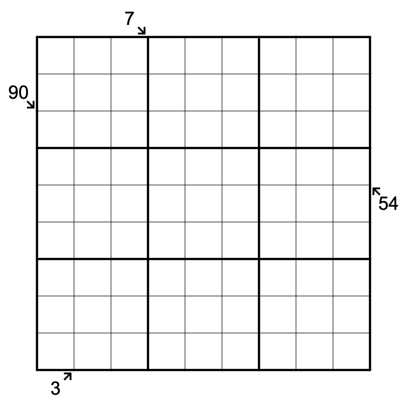 Each arrow clue outside the grid directs the path of a slow thermometer that moves diagonally in the indicated direction. The path may extend by bouncing off the edge of the grid at a 90-degree angle and continuing diagonally. Each number clue outside the grid gives the sum of all non-decreasing digits up to (and not including) the first digit that decreases along the path.