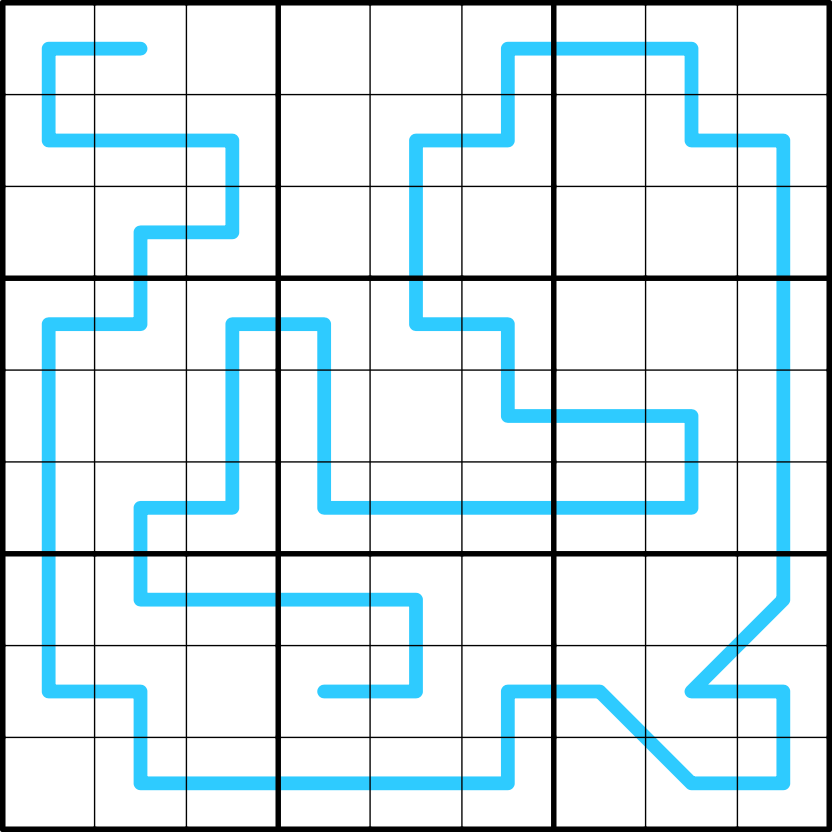 The 3x3 box borders divide the blue line into segments. Each segment's total is found by summing the digits on that segment. The segment totals must increase by 1 from one end of the line to the other. Adjacent digits along the line must not be consecutive.