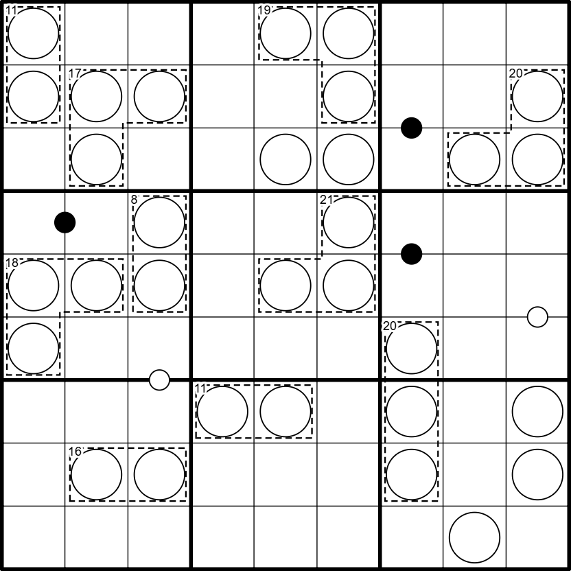 Kropki dots: Digits separated by white dots are consecutive. Digits separated by black kropki dots have a 1:2 ratio. Not all dots are given.