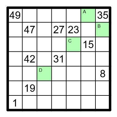 In jedes freie Feld ist eine Zahl zwischen 1 und 49 einzutragen, so daß jede Zahl genau einmal vorkommt und zwei aufeinanderfolgende Zahlen immer in orthogonal oder diagonal benachbarten Feldern stehen.